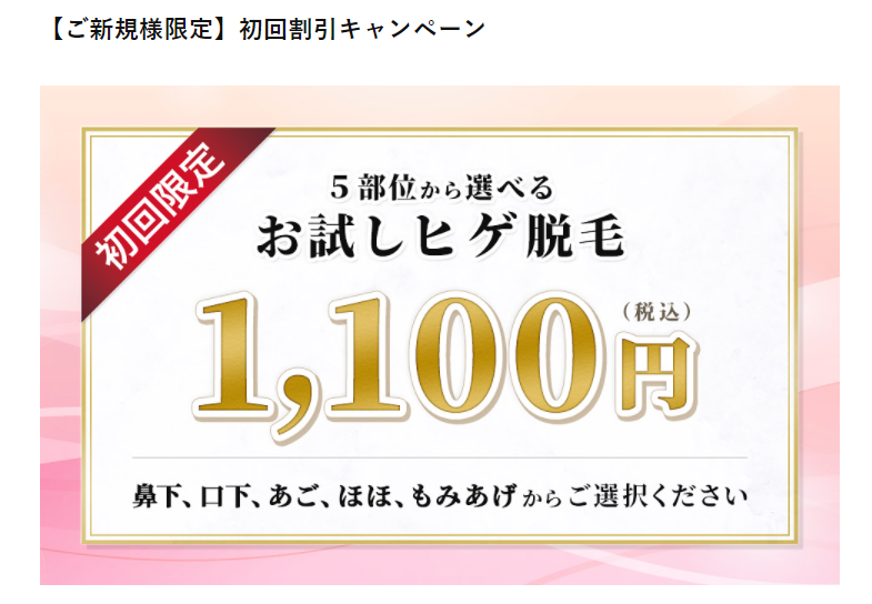 | ヒゲ脱毛(初回キャンペーン) | 1部位⇒1100円 |