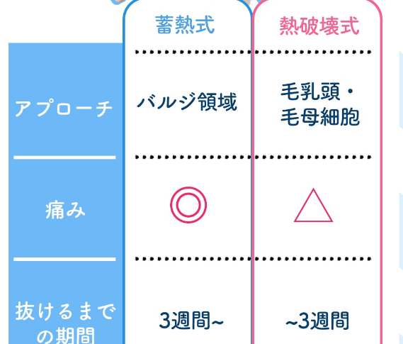 波長を持つ、「蓄熱式」で照射する事で、肌を傷つけずに毛根と毛胞を破壊し脱毛します。