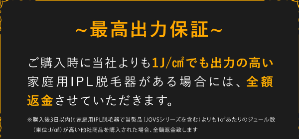 出力パワーが大きい、無制限照射回数、強力脱毛モードにより高品質な美肌効果が期待できる。