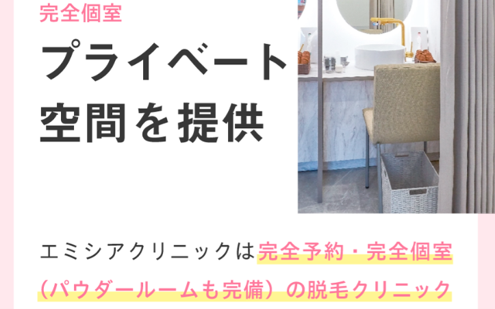 エミシアクリニックは、完全予約・完全個室(パウダールームも完備)の脱毛クリニックです。
