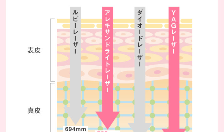波長を持つ、アレキサンドライトレーザー照射する事で、肌を傷つけずに毛根と毛胞を破壊し脱毛します。