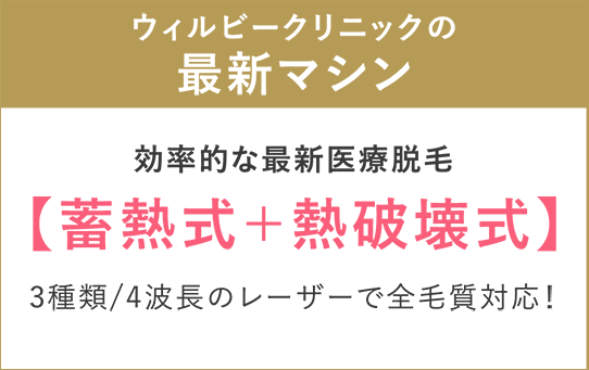細胞を破壊すると多少の痛みがあるのですが、「ウィルビークリニック」の最先端の機械でほぼ無痛で脱毛を実現!