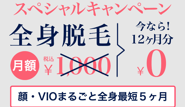 「ベルフィオーレ」は、料金が安い全身62部位の脱毛が月額1000円⇒12カ月0円。