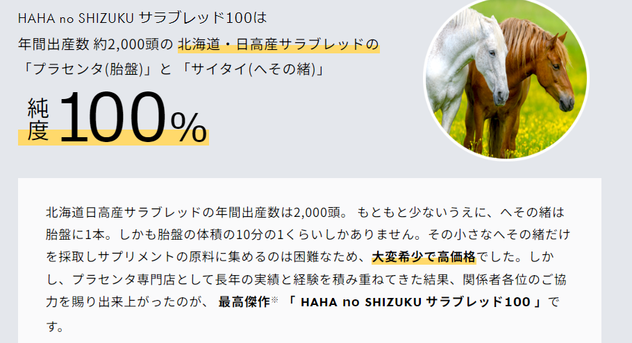 「母の滴 サラブレッド100」は、北海道・日高産のサラブレッドのプラセンタと臍帯 (サイタイ)を使用した、