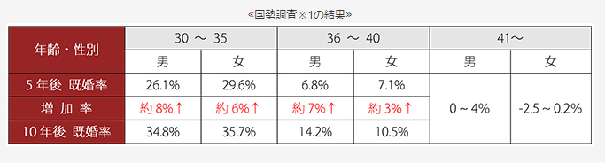 20代男女の結婚率が50%以上であるのに対し、30代以降になると、結婚率はがっくりと下がります。