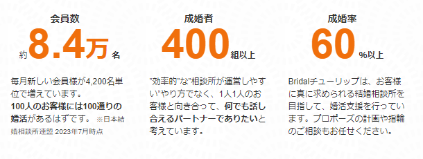 「Bridalチューリップ」では、豊富な会員データや、きめ細かいサポートを提供しています。