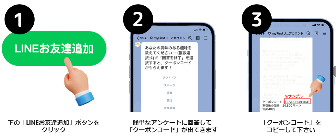 - 「myFirst公式」のオンラインストアで商品を購入する際に、クーポンコードを入力する。