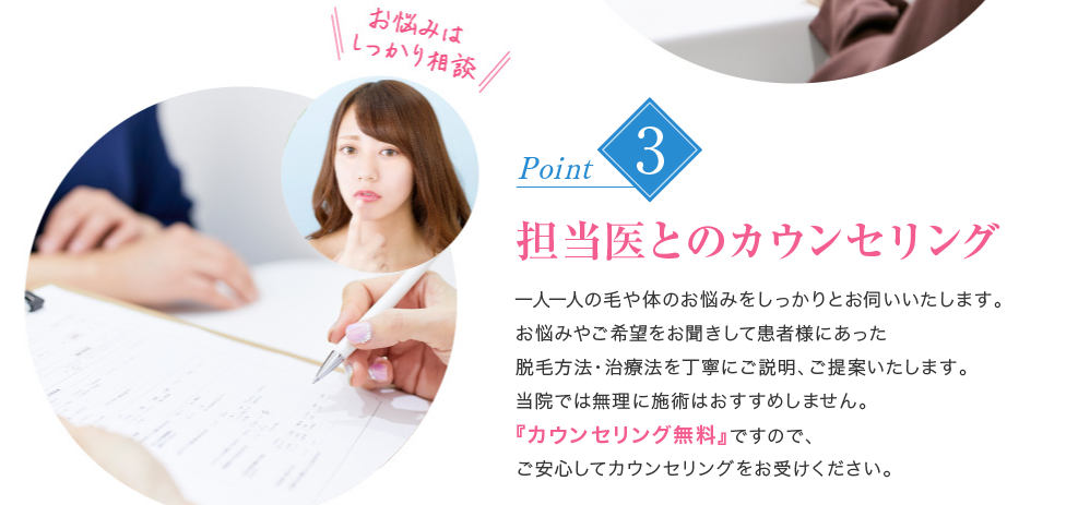 色黒、日焼け、デリケート肌などが原因で、脱毛に踏み切れなかった方も遠慮なく相談できますよ。