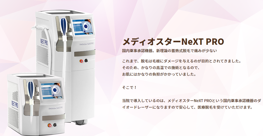 リアラクリニックでは、日本の厚労省にあたるFDAの承認を受けた「メディオスター NeXT PRO」が使われています。