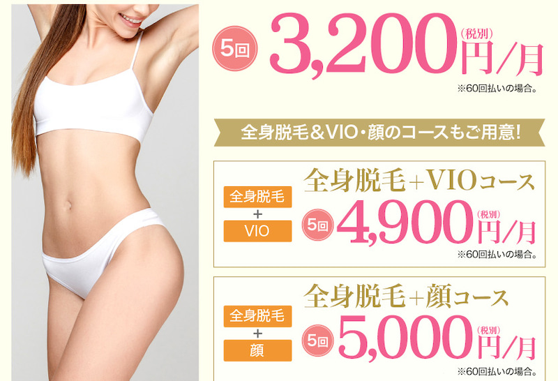 | まるっと全身脱毛5回コース | 一括129,000円⇒月々3,200円 |