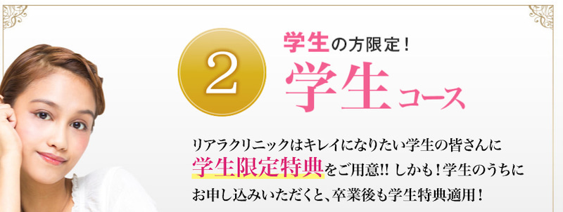 「リアラクリニック」は、お得な割引キャンペーン!「ペア割」「学割」「のりかえ割」がある。