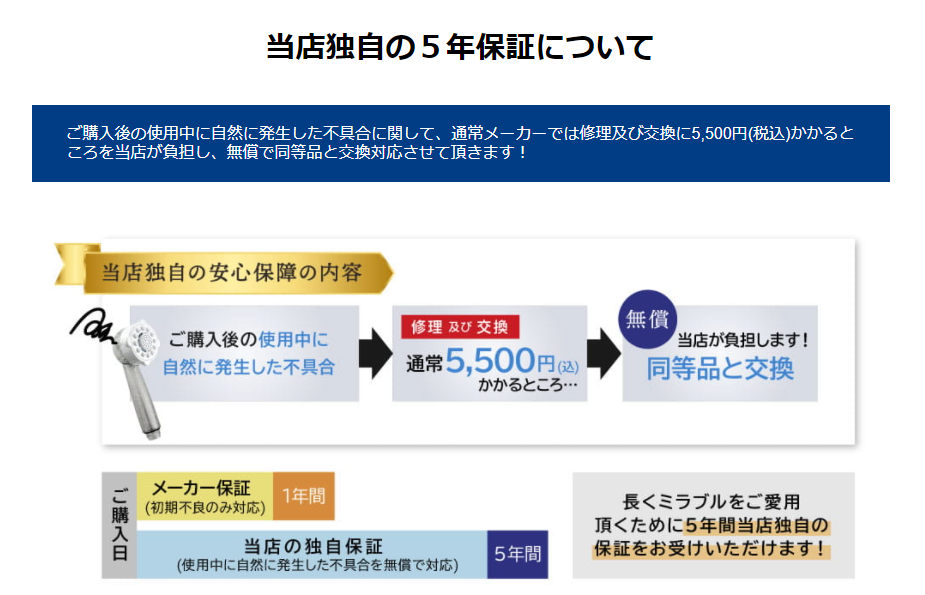 購入から5年間、自然故障の場合に同等品と交換対応が可能という独自の保証付き。