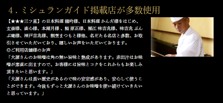 メディアでも注目され東京、大阪を中心とした多くのミシュランガイド掲載店が「大源味噌」を使用。