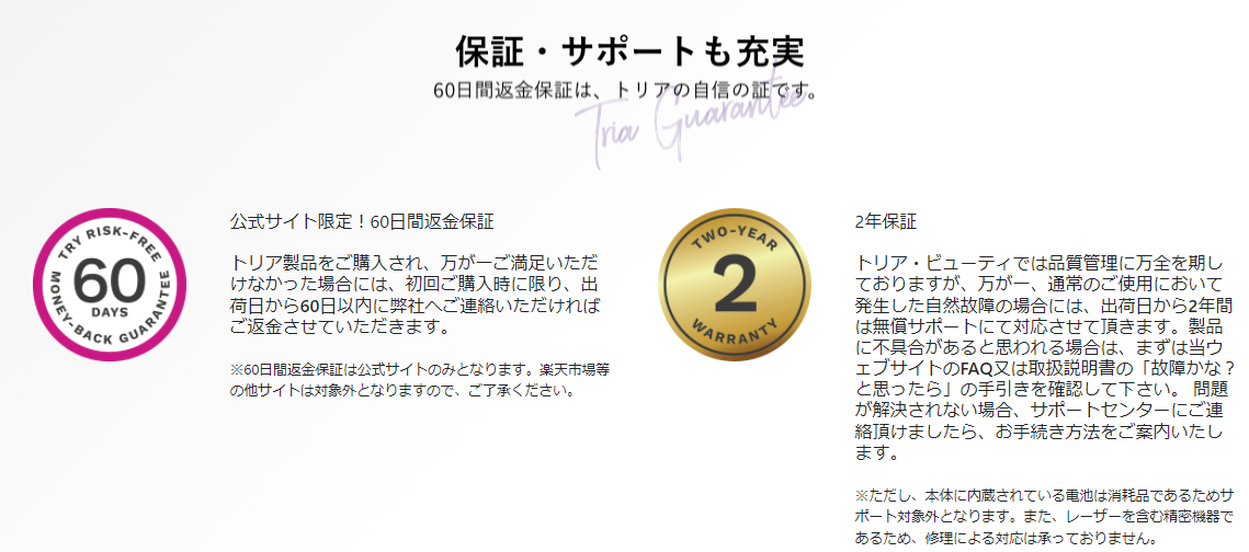 返金してくれる自信が、「トリアレーザー美顔器」販売店のプロ意識と紳士的な姿勢が感じられます。