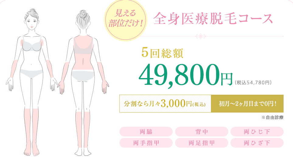 | 全身丸ごと!医療脱毛コース(5回) | 特別価格の129800円(税込) |