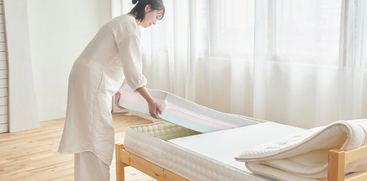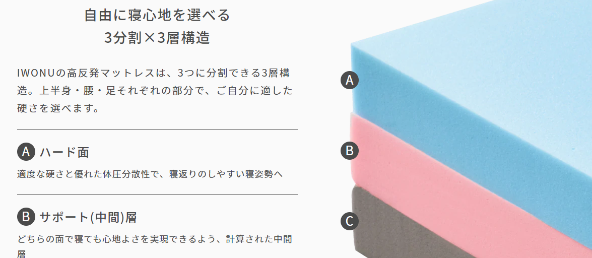 3つに分割できる三層構造で、腰痛や肩こりなどのからだの痛みにアプローチするマットレス。