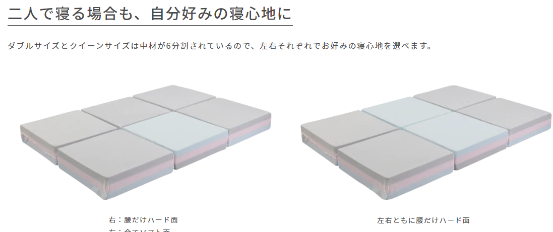 また、ダブルサイズであれば、左右それぞれで寝心地を選べるというメリットがある。